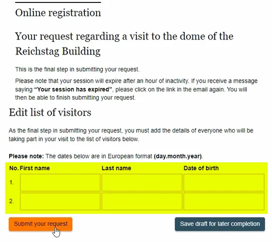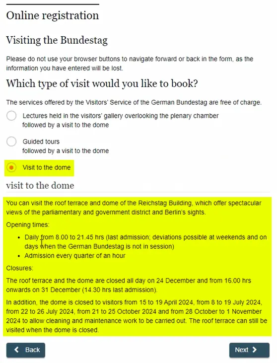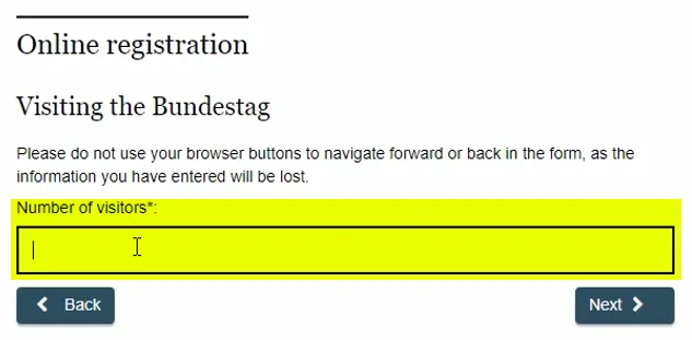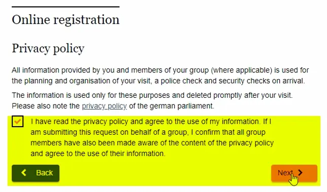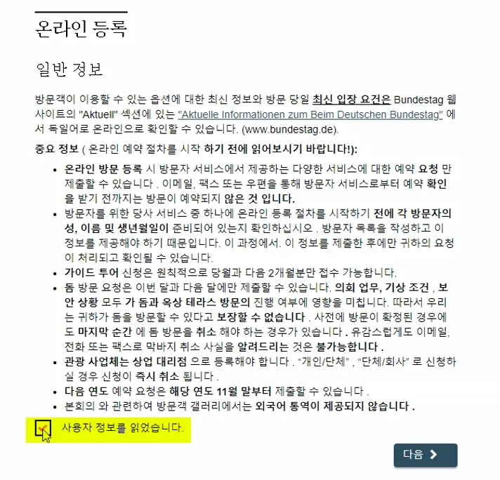 1. 독일 연방의회 홈페이지의 예약 메뉴에서 첫 페이지의 주의사항을 읽고 체크 박스에 체크합니다.