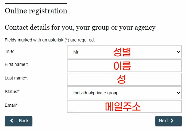 7. 예약자의 성별, 이름, 성, 메일주소를 입력합니다.