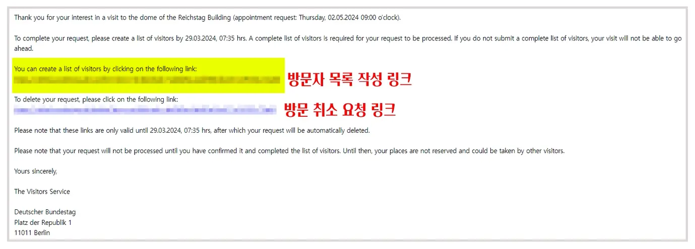 9. 입력한 메일주소로 온 메일의 링크를 클릭하여 본인을 포함한 방문자 목록을 작성하고 제출합니다.