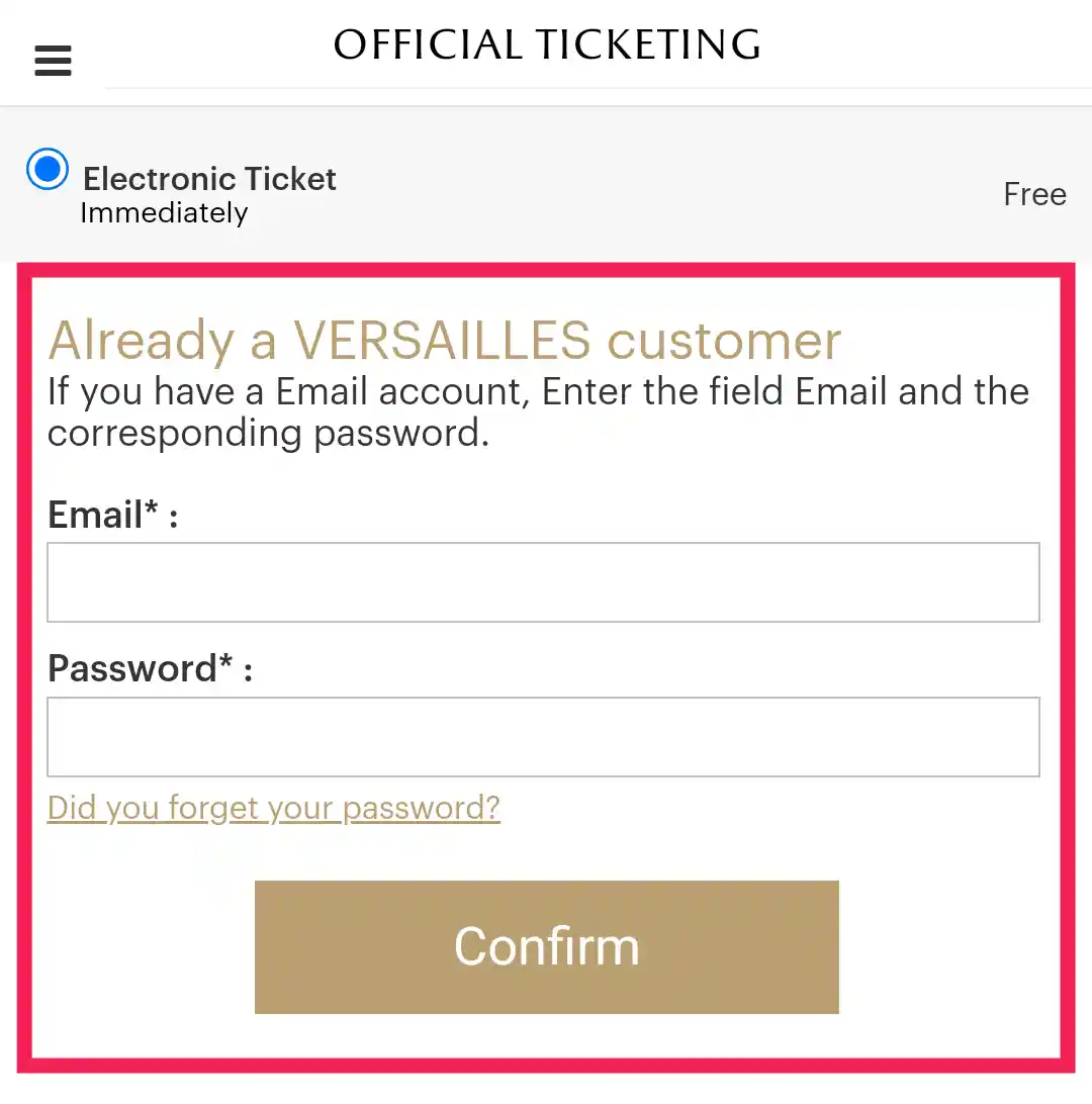 7 베르사유 궁전 방문이 처음이라면 E-Ticket을 수령할 개인정보를 'New VERSAILLES customer'에 입력합니다.