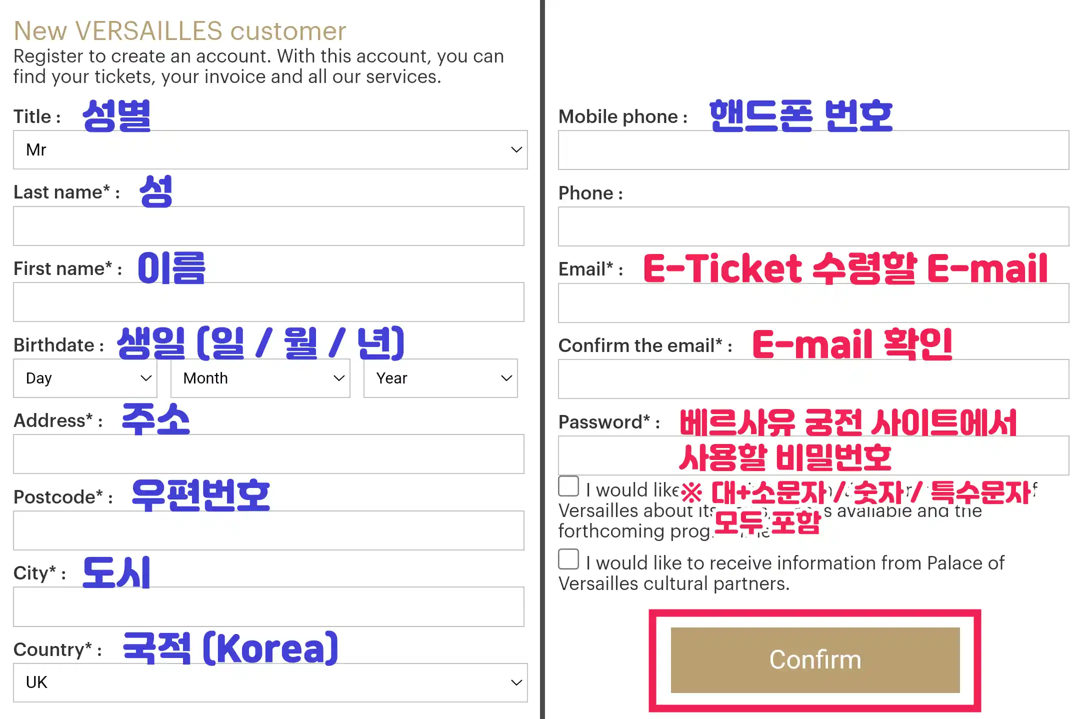 6 이미 베르사유 궁전에 등록된 계정정보가 있다면 'Already a VERSAILLES customer'에 'E-mail'과 'Password'를 입력해 주세요.
