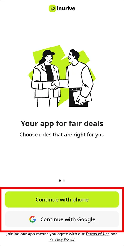 1 구글 플레이스토어(Android) 또는 애플 앱스토어(iOS)에서 'Indrive'를 설치 후 실행합니다.