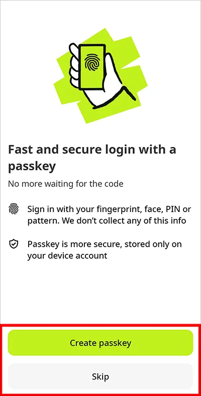 4 [Create passkey] 버튼을 눌러 지문, 얼굴, 패턴 등을 설정하거나 [Skip] 버튼을 눌러 건너뜁니다.