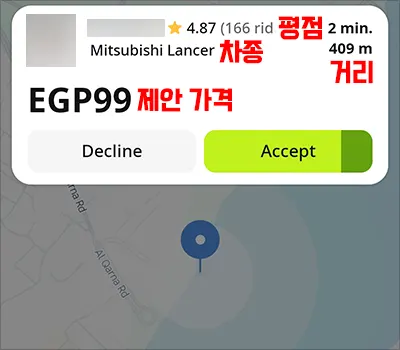 5 제안이 들어오면 가격과 평점, 차종, 거리 등을 확인하여 거절할 경우 [Decline], 수락할 경우 [Accept]를 클릭합니다.