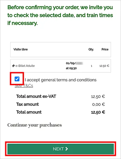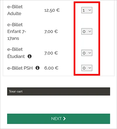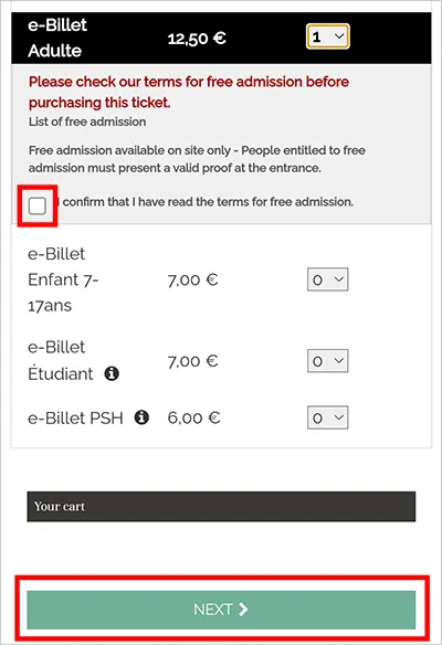※ 국제학생증이 있는 경우 e-Billet Étudiant를, 장애인의 경우 e-Billet PSH을 선택하시면 할인을 받을 수 있으며, 반드시 증명할 수 있는 서류를 지참해야 합니다.