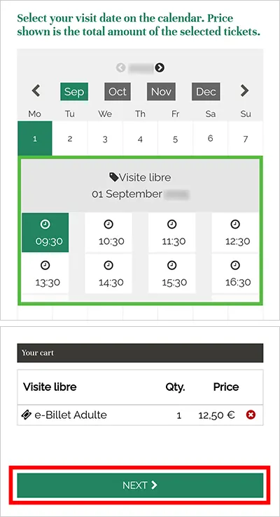 ※ 선택이 되지 않는 날짜나 시간의 경우 이미 예약이 마감되었거나 해당 날짜에는 현장 판매로만 티켓을 판매하는 경우일 수 있습니다. 또한 모네의 집은 동절기에 해당하는 11월-3월에는 개방을 하지 않습니다.
