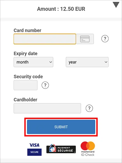 8 해외 결제가 가능한 신용카드의 카드 정보를 입력한 후 [Submit] 버튼을 클릭하여 결제를 진행합니다.