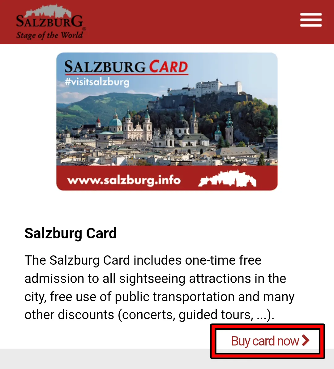 [잘츠부르크 카드] 온라인 구매 바로가기아래 링크를 클릭하면 바로 잘츠부르크 카드를 구매할 수 있는 페이지로 이동됩니다.