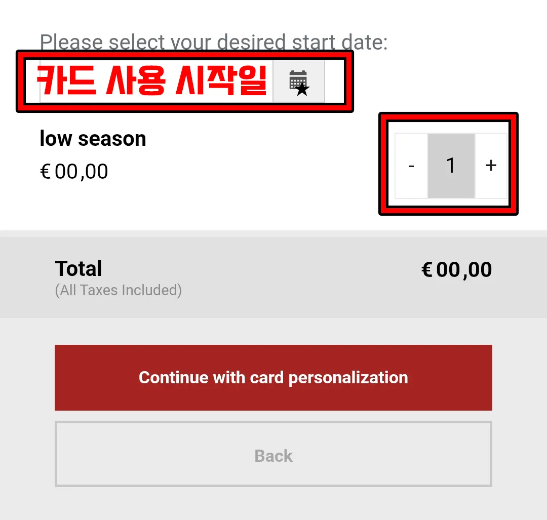 5 그 다음 '카드 사용 시작일'과 '수량'을 선택하고, 'Continue' 버튼을 눌러주세요.