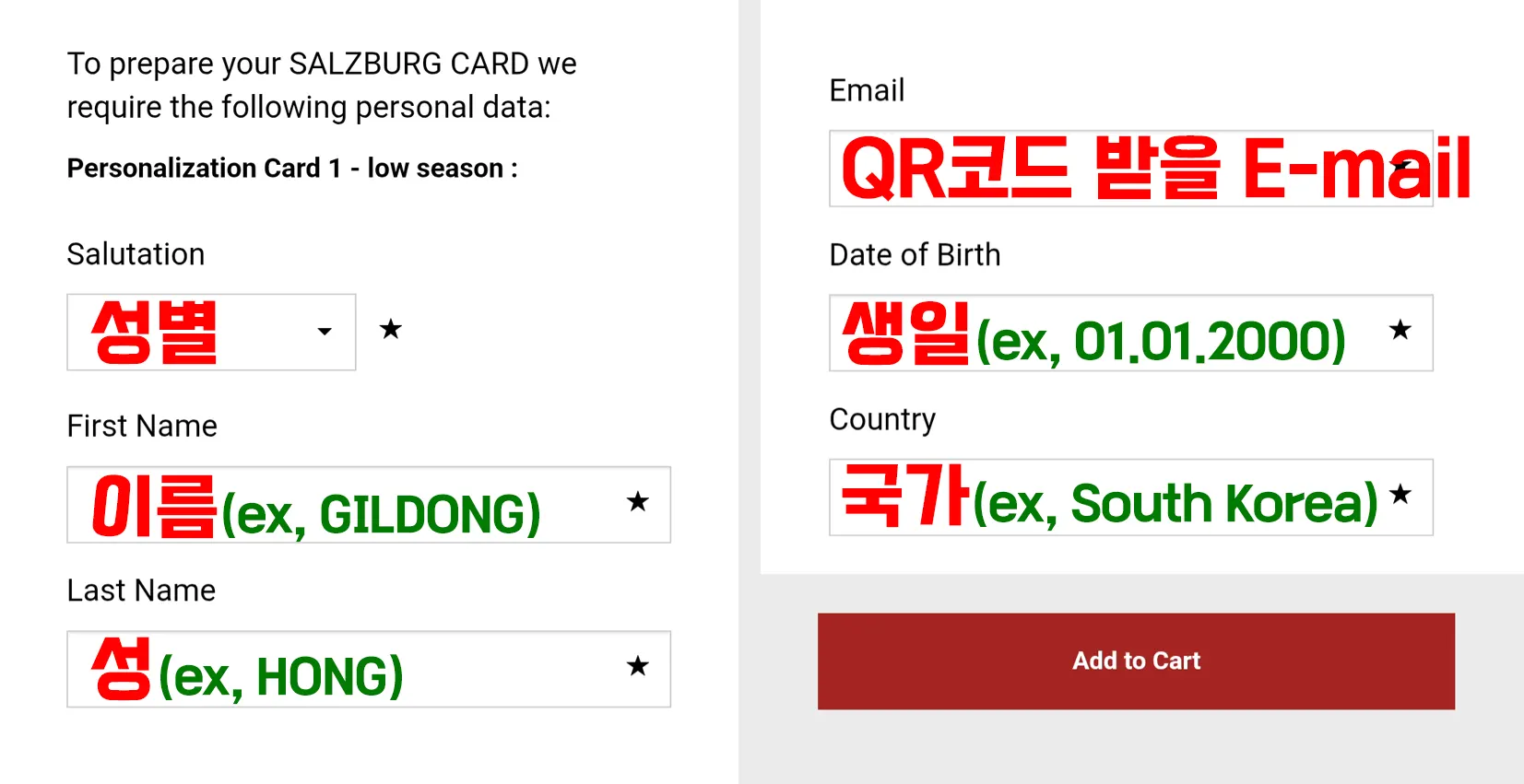 6 그 다음 '카드 사용자 개인 정보'를 입력하고, Add to Cart 버튼을 눌러줍니다.