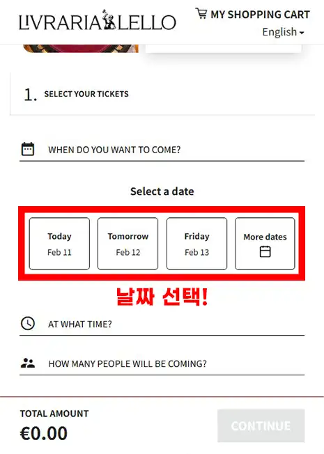 3 날짜 선택 페이지입니다. 원하시는 날짜를 선택해주세요. 기본적으로 오늘, 내일, 모레까지만 나오는데요, 오른쪽 끝에 위치한 More dates 버튼을 클릭하시면 더 많은 날짜를 선택하실 수 있습니다.