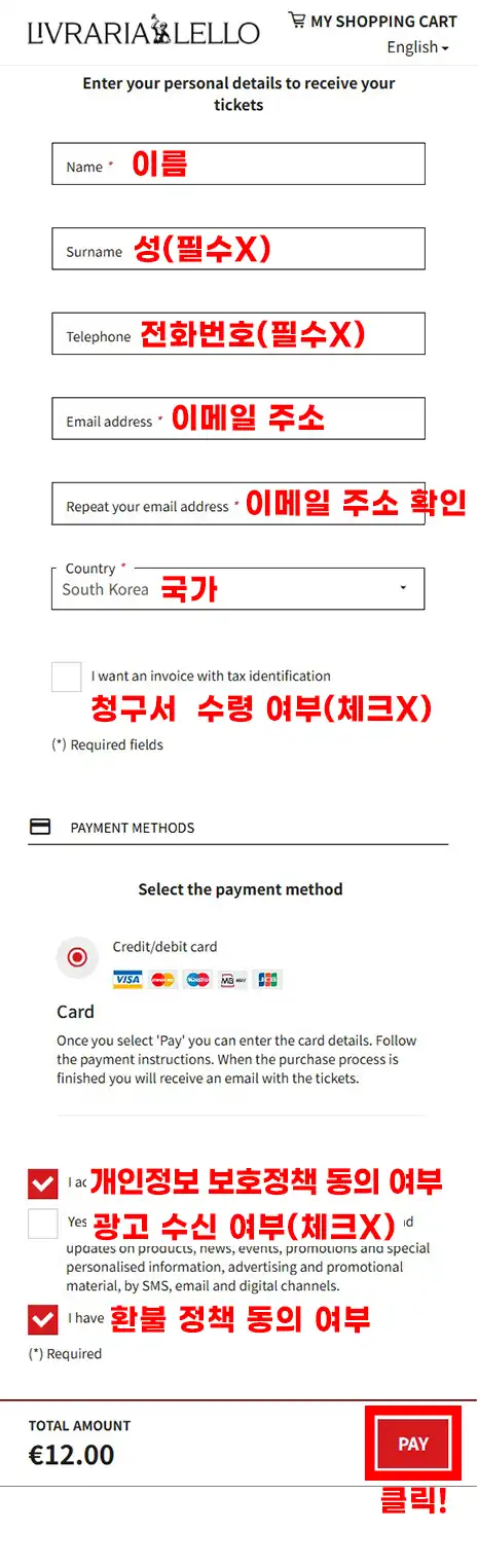 7 신용카드 정보를 기입합니다. 기본적으로 선택되어 있는 MB WAY는 포르투갈에서 가장 널리 쓰이는 모바일 결제 서비스인데요, 대부분 이용하지 않으실테니 그 아래, DEBIT/CREDIT CARD를 체크하여 정보를 기입해주세요. 다 기입하신 다음, 마지막 PAY 버튼을 눌러주시면 됩니다.