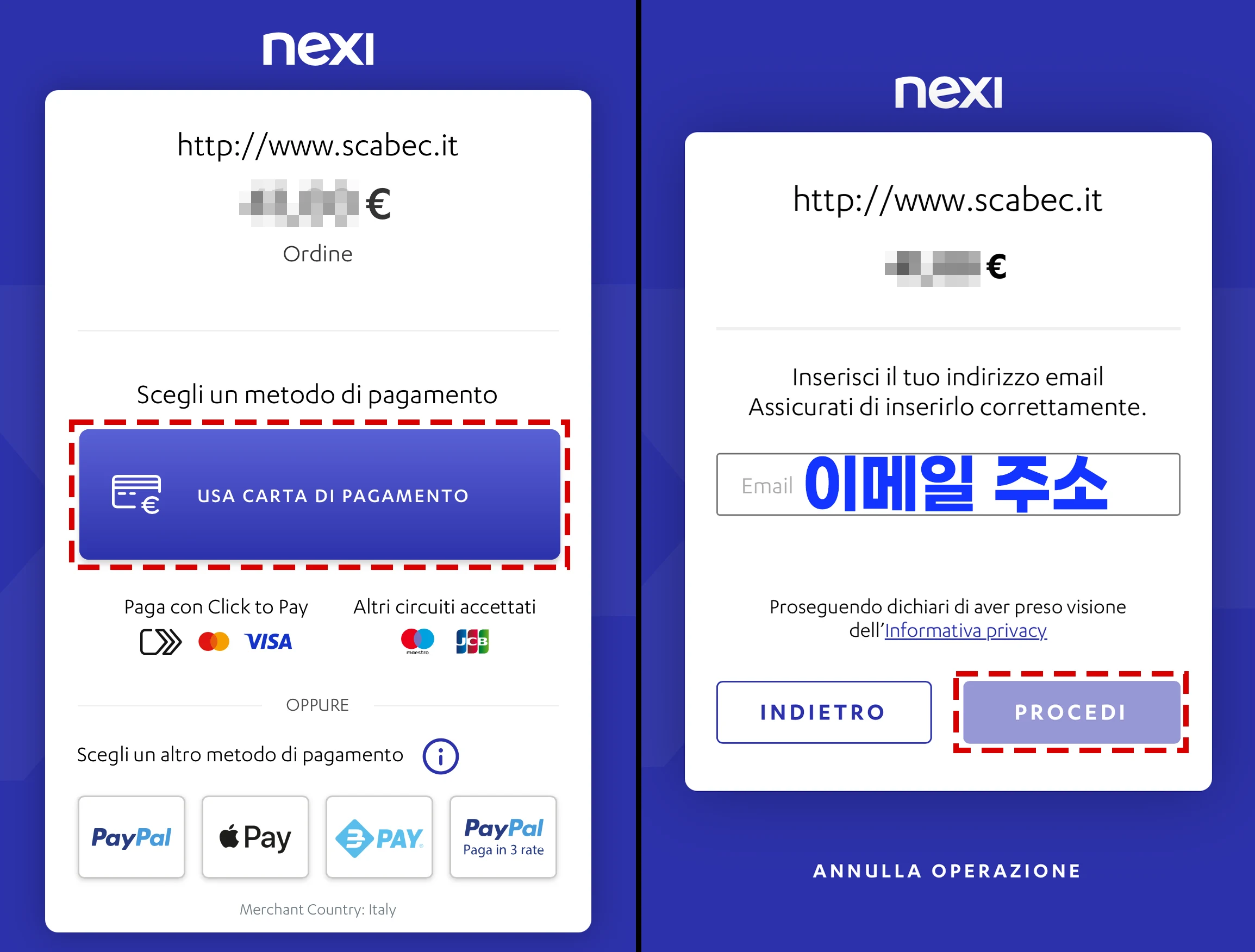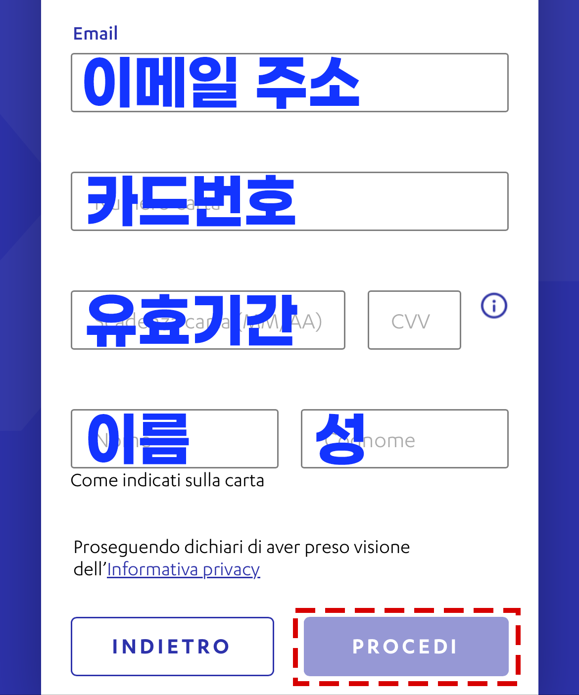 - Scadenza carta: 카드 유효 기간(MM/YY)