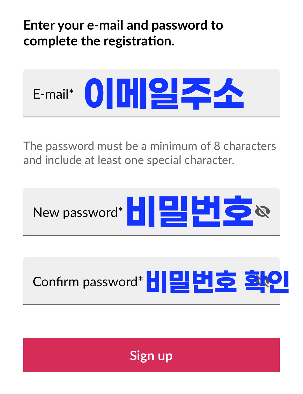 - Email : 이메일 주소(이전 단계에서 입력된 주소가 자동 표기됨)