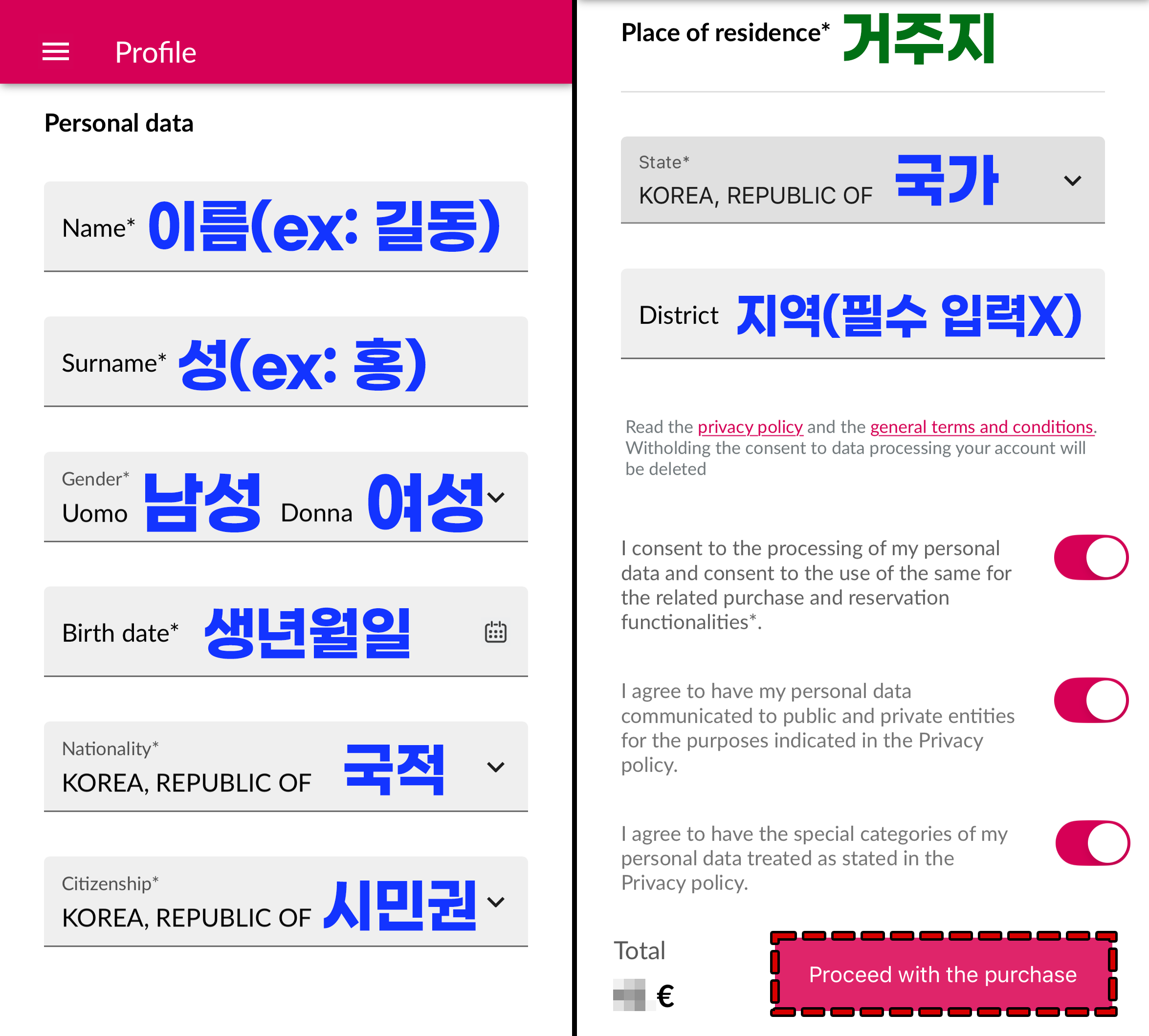 ⚠️국적, 시민권, 거주지를 대한민국으로 입력할 경우, 반드시 'KOREA, REPUBLIC OF'을 선택해주세요.