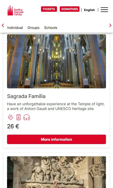1 아래의 링크를 통해 사그라다 파밀리아 공식 홈페이지에 접속하신 다음, 원하시는 입장권을 선택하신 다음, More information 버튼을 눌러주세요. 입장권의 종류는 아래와 같습니다.