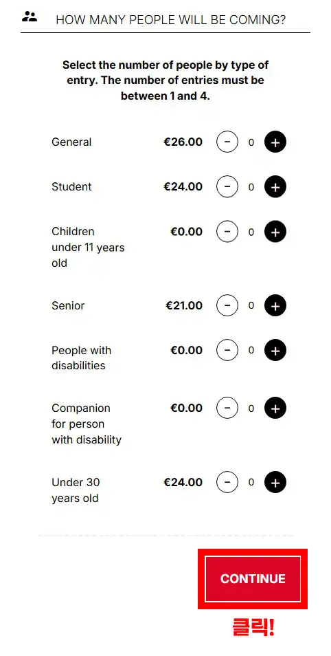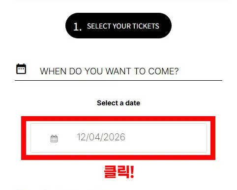 4 실제 방문할 날짜를 선택해주세요. 붉은색 밑줄이 쳐진 회색 날짜는 매진된 것입니다.