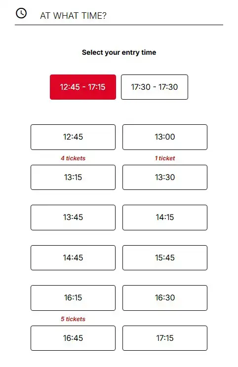 5 이제 입장 시간을 선택해주세요. 티켓이 얼마 남지 않은 시간대에는 밑에 잔여 수량이 표기됩니다.