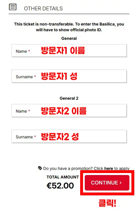 7 방문자의 이름과 성을 인원수에 맞춰 각각 기입해주세요. 여권에 표기된 성명 그대로 적어주시면 됩니다. 전부 기입한 다음, CONTINUE 버튼을 눌러주세요.