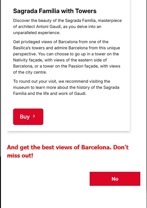 8 만일 탑을 제외한 사그라다 파밀리아 성당 입장권만 선택했다면 탑이 포함된 입장권으로 변경하지 않겠냐는 팝업이 뜹니다. 변경하고자 하신다면 Buy 버튼을, 변경하지 않고자 하시는 분은 No 버튼을 눌러주세요.
