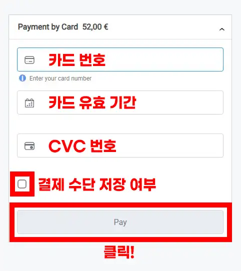 11 결제할 카드 정보를 기입한 다음, Pay 버튼을 클릭하면 결제가 완료됩니다. 아래의 체크 박스는 결제 수단 저장 여부이므로 굳이 체크하지 않으셔도 됩니다.