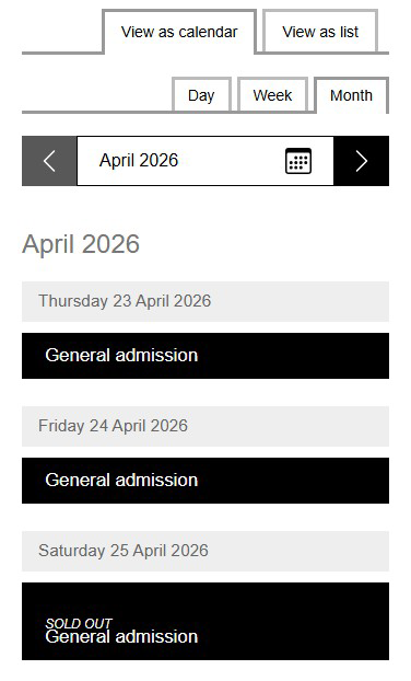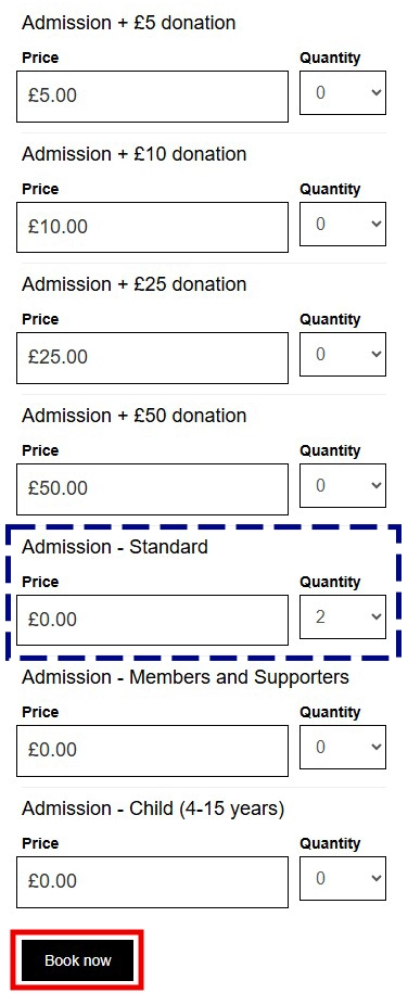 5 날짜를 선택한 다음, 아래쪽에서 티켓을 선택하고 아래쪽의 [Book now] 버튼을 눌러 주세요. 이때, 무료 입장은 'Admission - Standard'를 클릭하시면 됩니다.