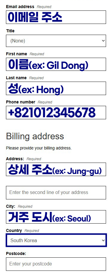 - Phone number: 국가 번호 +82 뒤에 처음 0을 제외한 휴대폰 번호 입력(010-1234-5678의 경우, 사진과 같이 입력)
