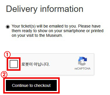 11 입력을 마친 후에 하단의 Delievery information에서 '로봇이 아닙니다' 체크하고 사진 인증을 마친 후, [Continue to checkout] 버튼을 눌러 주세요.