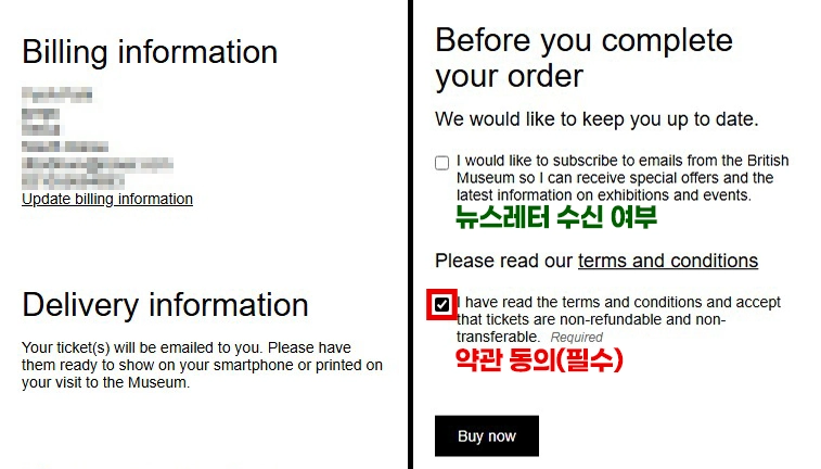 12 최종적으로 예약 정보를 확인한 후, 약관 동의 체크 후 [Buy now] 버튼을 선택해 주세요.