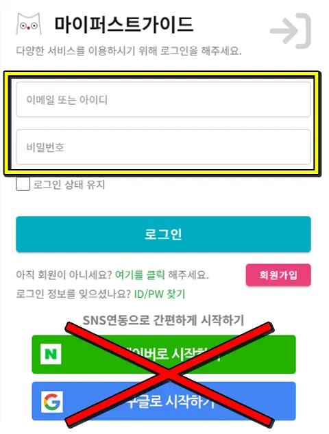 ※ 아래 [네이버/구글/애플로 시작하기] 버튼을 누르시면 안됩니다.
