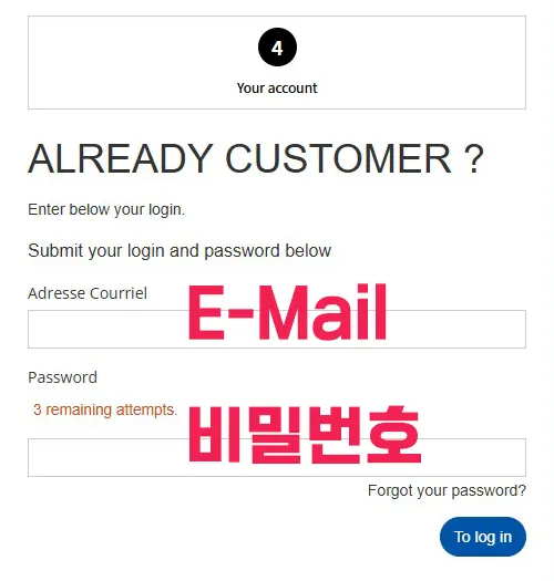 8 이미 오르세 미술관 등록된 계정정보가 있다면 'ALREADY CUSTOMER?'에 'E-mail'과 'Password'를 입력해 주세요.