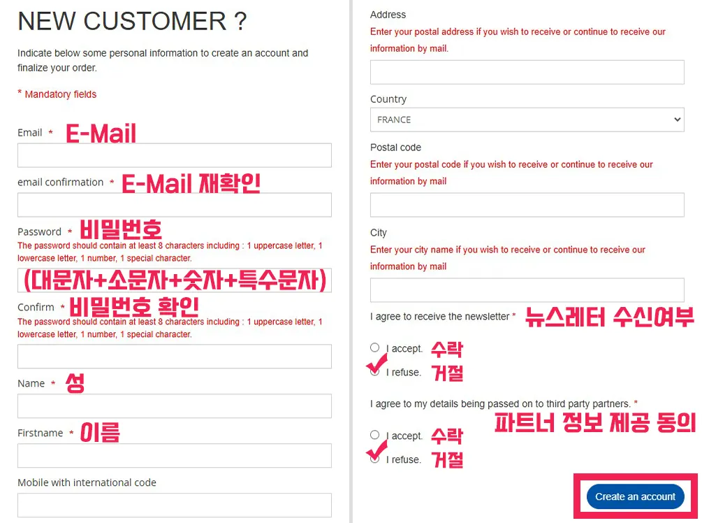 10 모두 입력하신 다음 하단에 'Create an account' 버튼까지 눌러주세요.