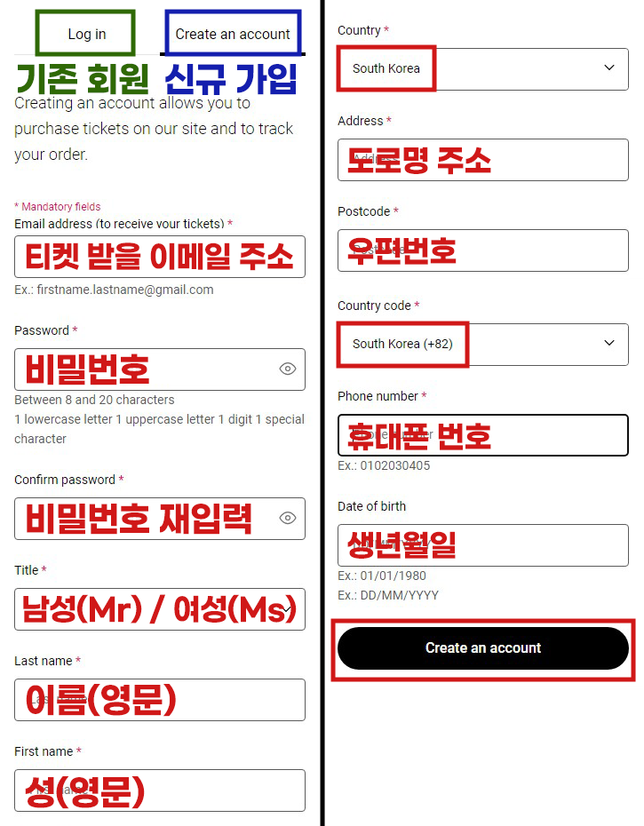 - 회원 가입 시에 입력한 이메일 주소로 티켓이 발송되니 수신 가능한 이메일 주소를 입력해 주세요. 생년월일의 경우, '일/월/연도' 순으로 기재하시면 됩니다.