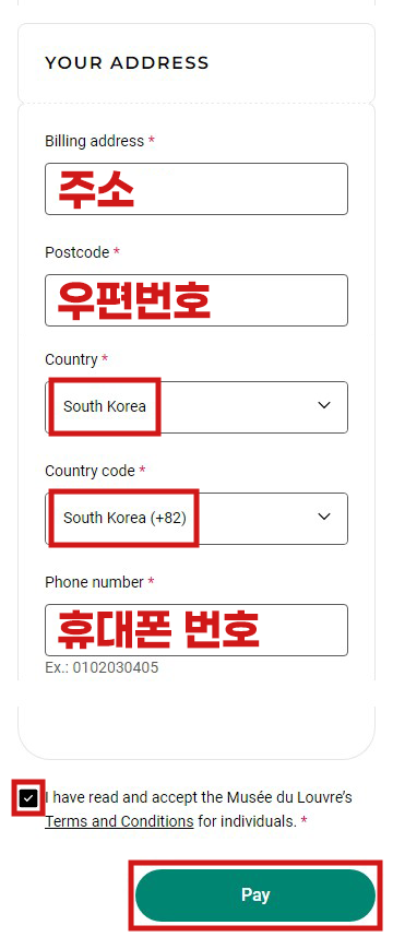 10 회원 가입 시에 기재한 정보가 자동 입력됩니다. 정보가 일치하는지 확인 후, 아래의 동의 사항에 체크하고 'Pay' 버튼을 눌러 주세요.
