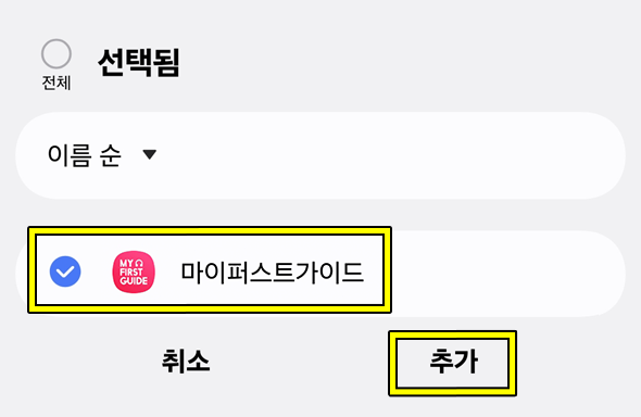5) 오른쪽 위에 '+' 버튼을 눌러 [마이퍼스트가이드]를 찾아 체크하고, 하단의 [추가] 버튼까지 눌러주세요.