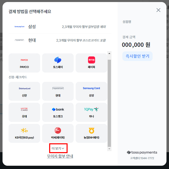 2) 신용카드 결제창이 생성되면 신용카드 선택 부분에 [더보기]를 눌러, 해외 부분에서 [해외 VISA] 또는 [해외 MASTER]를 클릭하여 결제를 진행합니다.
